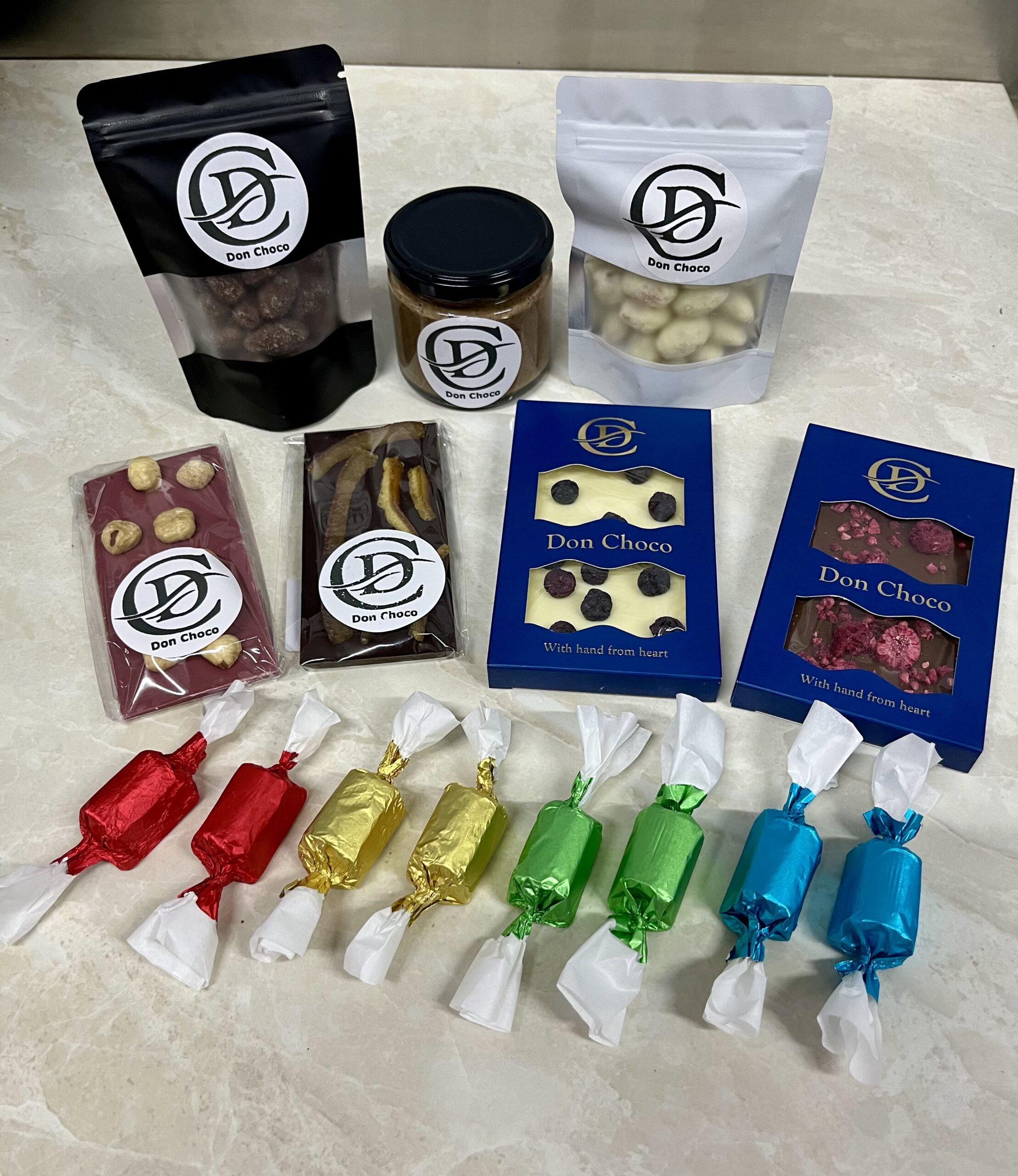 -1 db ruby csokoládé (50g), 1 db ét csokoládé (50g), 1 db tej és 1 db fehér csokoládé (100-100g)… a csokoládék ízeit ha szeretnéd te állíthatod össze..(liofilizált eper, málna, áfonya vagy olajos magvak: kesudió, pisztácia, pekándió, törökmogyoró), de ha ránk bízod akkor igyekszünk a legjobb variációkat összeállítani! Csak a táblás csokoládékra érvényes ez a lehetőség!